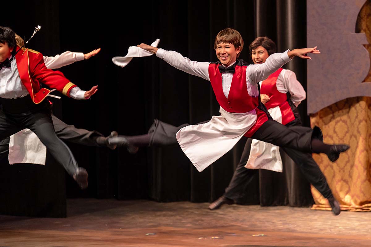 Among those receiving Dolly’s interventions are young artist Ambrose (Bryana Harty ’27) and Horace’s weepy niece, Ermengarde (Emmy McHugh ’26), as well as Horace’s eager clerks Cornelius (Judith Riley ’25) and Barnaby (Vivi Taylor ’28). Dolly guides the clerks to a hat shop in New York, where they meet owner Irene (Charlotte Nick ’26) and her assistant, Minnie (Kaia Castro-Dara ’25), and soon find themselves in over their heads. When everyone’s lives collide at the posh Harmonia Gardens restaurant, the story turns to misunderstandings, polka dancing, a visit to night court, declarations of love—and eventual happy endings.