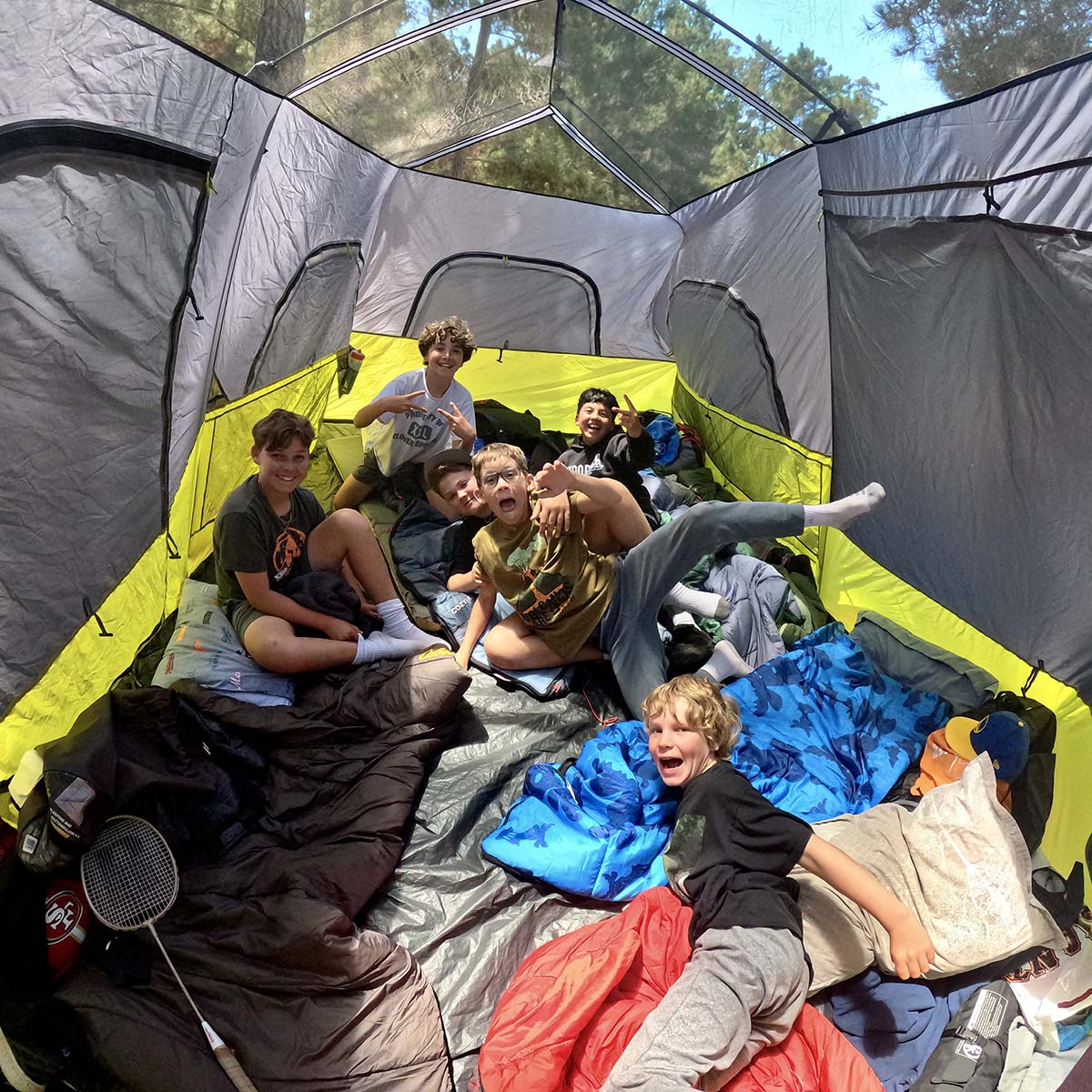 Our week culminates in an overnight local camping trip Thursday night to Friday morning. Group camping supplies are provided, with campers bringing their own sleeping bags and personal overnight bags. Campers cook their own dinner and are provided breakfast Friday morning. Campers sleep in tents in small groups and enjoy a final fun evening with a campfire, s’mores, and more.