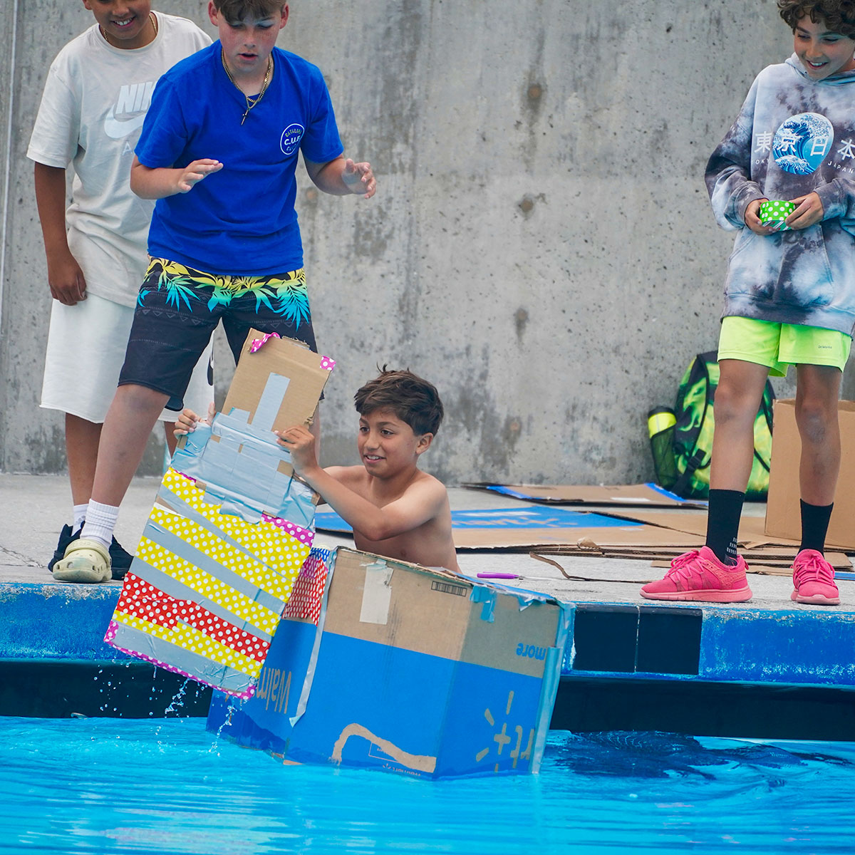 Throughout the week, campers participate in team-building activities focused on collaboration, communication, creativity, and healthy competition, including a design challenge culminating in a cardboard regatta. Each day concludes with campers coming together to reflect on their leadership learning from the day.